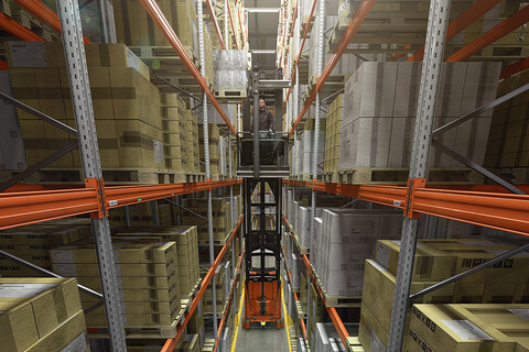 Preparación de pedidos de alto nivel y manipulación completa de pallets en pasillos guiados por cables o raíles